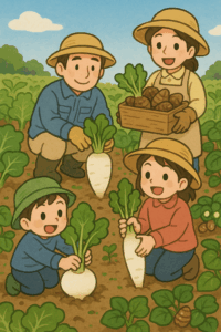 「うんとこしょ、どっこいしょ!」 まるで絵本『おおきなかぶ』のように、みんなで力を込めて引っ張ります。 なかなか抜けずにしりもちをついてしまったり、お友達と協力したり。 「せーの!」 スポン!と見事なダイコンやかぶが抜けた瞬間、「とれたー!」「見て、こんなに大きいの!」と、土のついた野菜を誇らしげに見せてくれました。