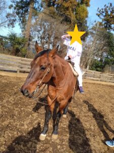 待ちに待った乗馬体験では、牧場スタッフの方に手伝ってもらいながら馬の背中の上へ。