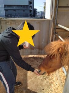 まずは餌やりからスタート。最初は大きな馬やヤギに少しドキドキしていた子もいましたが、専用の餌を手にのせて、勇気を出して「どうぞ!」と差し出していました。