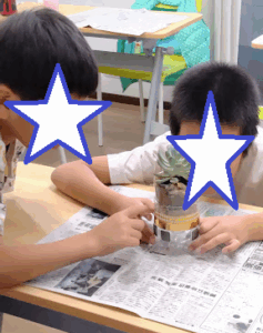 次は、その植物を植える鉢作り。今回は、再利用したペットボトルを使ってオリジナルの鉢を作りました。マジックでカラフルに色を塗ったり、キラキラのタイルシールを貼ったり、ボンドで紐をくるくる巻いたりと、それぞれの個性が光る素敵な作品がたくさん出来上がりました。