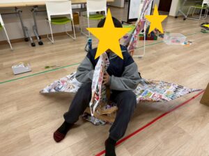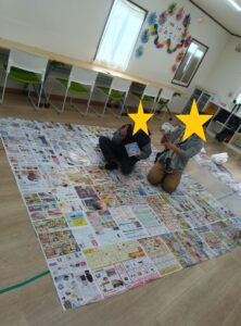 用意したのは、なんとチラシ50枚。これらをつなぎ合わせて、一枚の大きな紙に見立て、巨大な折り紙を作りました。普段の折り紙とは違い、サイズが大きい分、形を整えるのにも工夫が必要でした。