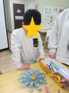 先日、壁面画制作に取り組みました。紙テープで作る立体的なお花にチャレンジです。