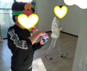 2月2日の活動は、節分のお面と、風船を材料にした豆鉄砲を作って遊びました。まずは好きな色や模様を選び、お面を思い思いに飾りつけ。目や角のデザインを工夫したり、表情を描き足したりと、同じ材料でも仕上がりは十人十色で、子どもたちの個性がキラリと光っていました。