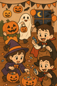 さあ、自慢の衣装に着替えたら、次はお待ちかねの「お菓子探しゲーム」です! 「トリック・オア・トリート!(お菓子をくれないとイタズラしちゃうぞ!)」 元気な掛け声とともに、教室のあちこちに隠されたお菓子(またはお菓子の引換券)を探します。