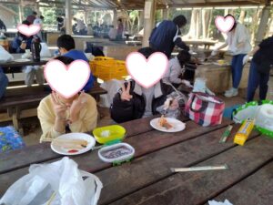 そして待ちに待ったお食事タイム!お肉や海鮮、焼きそばに加えて、焼きマシュマロも大人気。とろ〜り甘くなったマシュマロを頬張りながら、「おいしい!」の声があちこちから聞こえてきました。みんなで準備して、みんなで食べる。協力する力や「一緒に楽しい」を感じられる、あたたかな一日になりました。